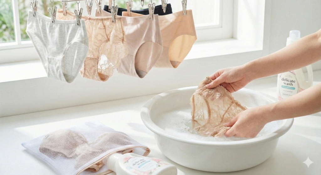 お気に入りのショーツを長く愛用するためのベストな方法は、間違いなく「手洗い」です。洗面器にぬるま湯と中性洗剤を入れ、優しく振り洗いをするだけで、生地の摩擦や型崩れを劇的に防げます。 しかし、忙しい毎日で毎回手洗いは難しいもの。洗濯機を使う場合は、必ず「下着専用の洗濯ネット」に入れましょう。その際、ぎゅうぎゅうに詰め込まず、少し余裕を持たせるのがコツです。また、他の衣類のホックやファスナーに引っかからないよう注意し、コースは「手洗いコース」や「ドライコース」などの弱水流を選んでください。レースやシルクなどの繊細な素材は、面倒でも手洗いを徹底することをおすすめします。