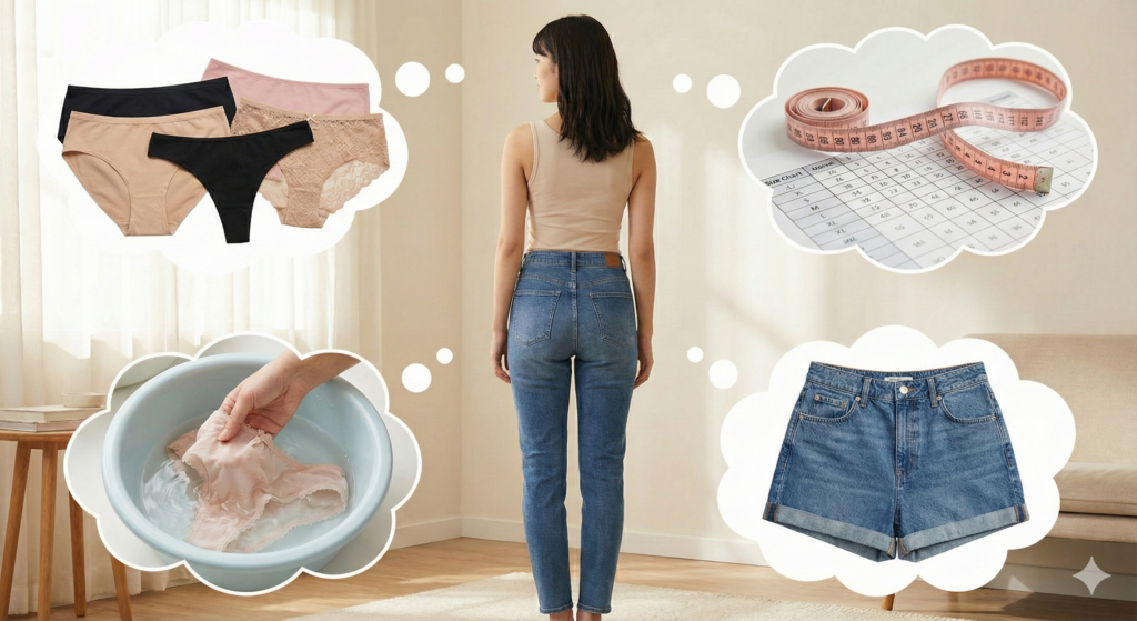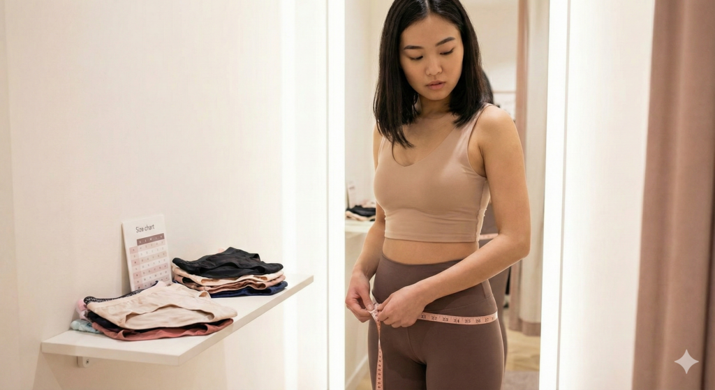 ショーツ選びで最も大切なのはサイズ感です。小さすぎると血行不良や黒ずみの原因になり、大きすぎるとズレて不快感につながります。 ヒップの一番高い位置の周囲を測り、メーカーのサイズ表と照らし合わせましょう。S・M・L表記だけでなく、ヒップサイズ(cm)を確認するのがポイントです。特に体型が変わりやすい時期や、メーカーを変える際は、面倒でもメジャーで測り直すことをおすすめします。ジャストサイズを選ぶことが、美しいヒップラインへの第一歩です。